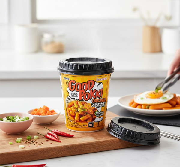 Está diseñado para ser fácil de preparar en el microondas, lo que lo convierte en una opción práctica para quienes buscan un snack o comida rápida con un toque coreano auténtico. Su textura es masticable y suave, con una salsa espesa y cremosa que cubre bien los pasteles de arroz.